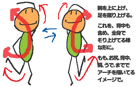 股を意識して足を後ろに蹴り上げ、反対の手を