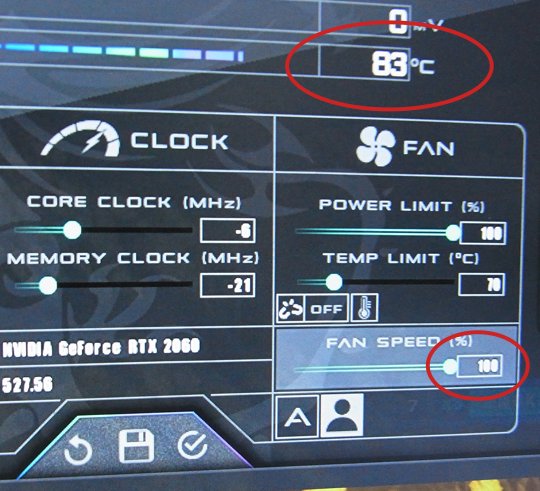 しかし、するとすぐに80度を超えました。ファンを100%までにして、最大回転数にしますと、爆音とひきかえにようやく70度台には下がります。しかしk,70%でも85度になってしまいました。