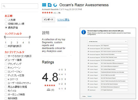 以前、衣袋さんも紹介していた、Web解析界の権威、アビナッシュ氏のソリューションフルセット。カスタムレポート、カスタムセグメント、マイレポートがまるまるインポートできます。