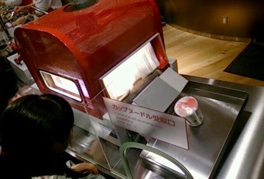 上図のように、カップヌードルづくりには、(1)カップのデザインと(2)具材の充填、という工程にわかれます。カップヌードルづくりをはじめる前にまずは行列に並びます。つまり3回の行列に並ぶことになります。