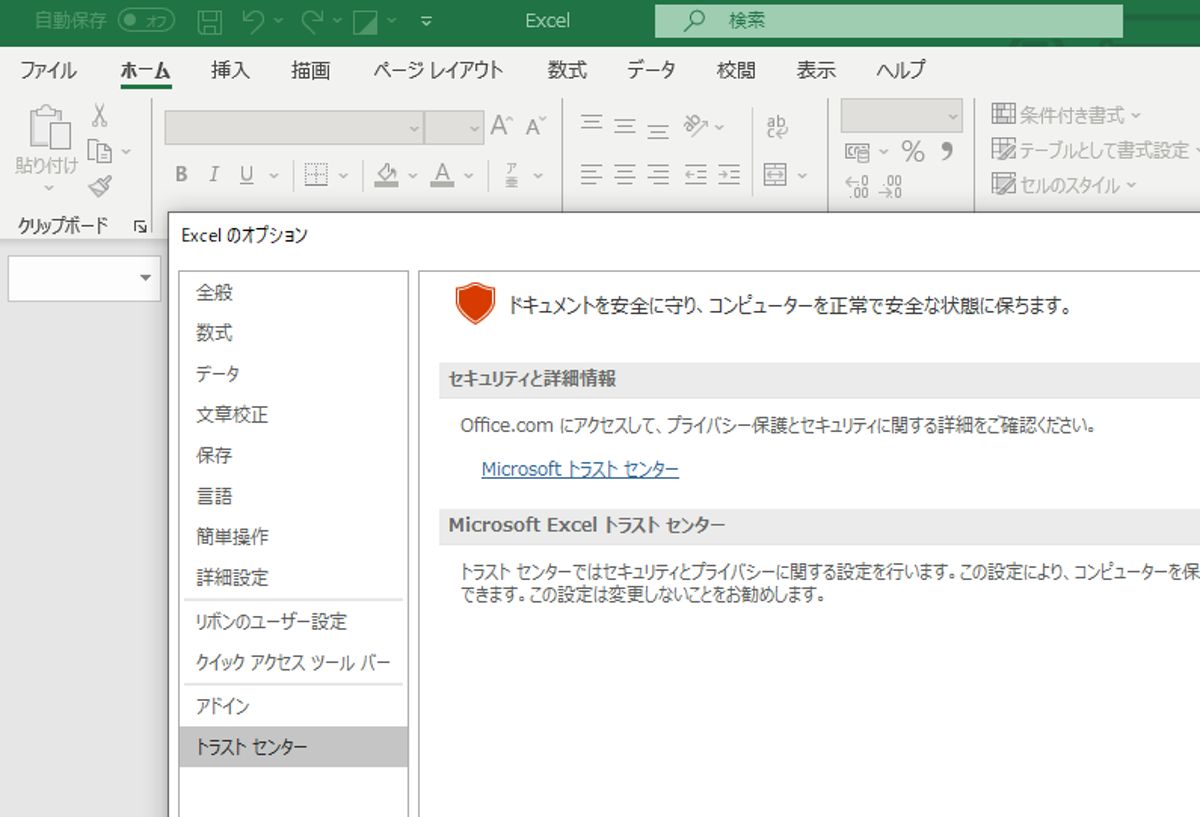 Office365のEXCELを開きます。画面左下のオプションを選びます。そこで、「トラストセンター」を選びます。