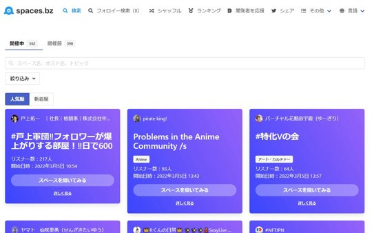 なお、Twitterスペースではポータルとなる総合的な検索画面がありませんので、上記のspaces.bzというランキングサイトをブックマークしておくと、便利に音声ライブ配信をさがせます。