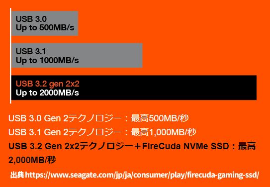 先日発表され、SSDが爆速!と評されたソニーのPS5でも、5GB/s です。USB 3.2 Gen 2×2は、まさに、その4倍もの読み込み速度という爆速ぶりです。