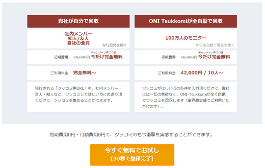 「大きく2種類の料金プランを用意しています。継続的なサイト改善をされたい企業様向けの『継続利用型』と、例えばネットアンケートの代わりの手段として単発でツッコミを集めたい企業様向けの『単発利用型』です。いずれの料金プランも、回収したいツッコミ数によって料金は変わってきます。ただ、いずれにせよ本当に納得してから使って頂きたいので、お気軽にお試し頂ける『完全無料のお試しプラン』もご用意しております。 」