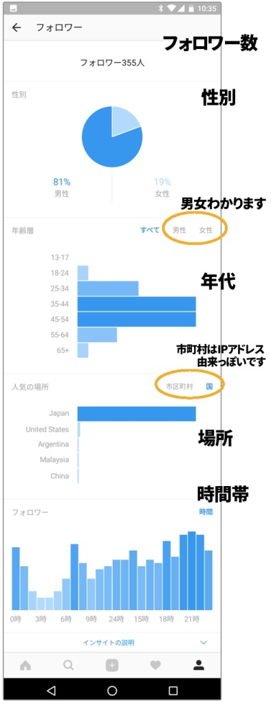 「もっと見る」をタップしますと、以下のような画面に移動します。これがInstagramインサイトのフォロワー分析画面です。