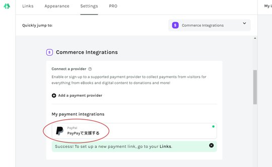 すると、リンクツリーのマイページで、PayPal決済が可能になったむねが、表示されます。