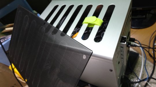 を購入し、自作PCの組み立てをしました。当時、実売だいたい11万円くらいだったと思います。ケースが小さいため、CPUファンも干渉しないように小さいものとか、もともと排熱が弱いため強制排熱ファン2連を追加したりと、いちおうは考えて買いました。