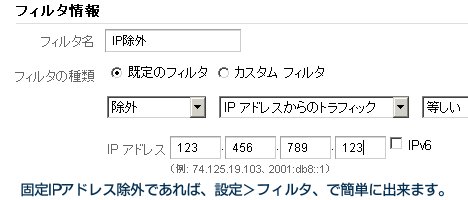 IPアドレスが固定であれば、(最近は入力フォーム形式になったので)最も除外しやすいと思います。しかし、IPアドレスが変わってしまうモバイルなどの場合、ちょっと難しい。